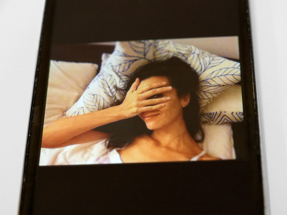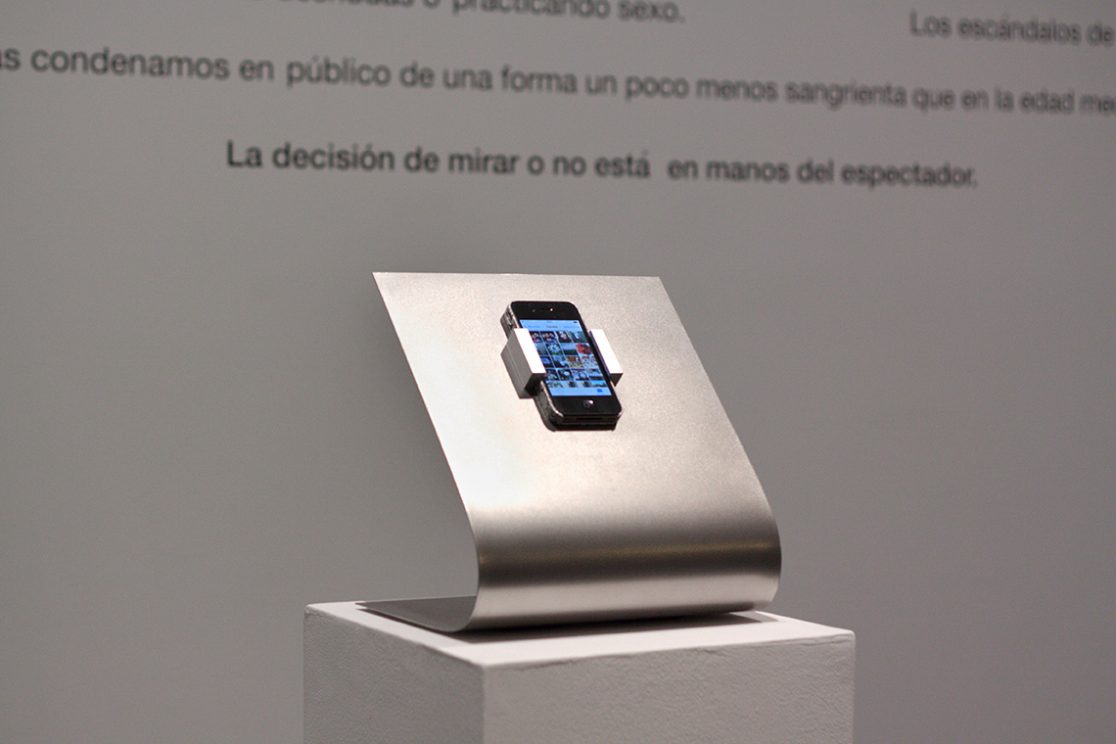 The exhibition features a single artwork: the artist’s own smartphone displayed in the gallery space, allowing the visitor to freely access her private photo-gallery. Through this experience the artist gives the spectator the chance to decide whether to have a look or not, bringing up some issues like the vulnerability we are exposed to by using mobile devices, the constant exposure of the woman’s body in the media or the market that these images generate.
